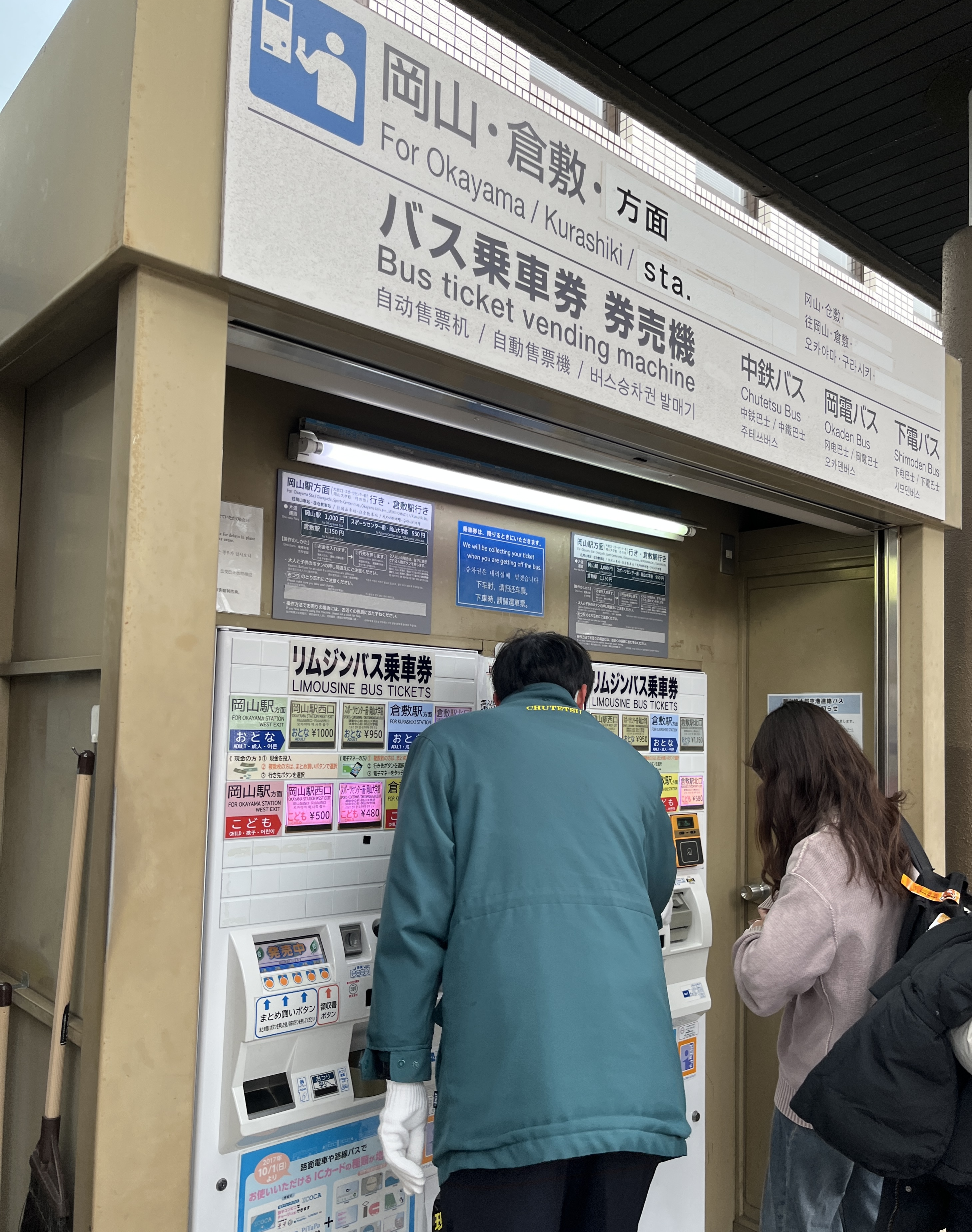一出岡山機場就有人員協助使用機台購票大巴(崗山桃太郎空港-岡山駅西口),很有趣的是他們都說日文,但你就是可以聽懂他們的指令哈哈。車程約半小時,人滿就發車!